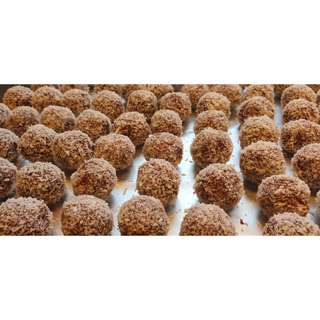 Zutaten: Edelbitterschokolade, Butter, Vanillezucker, Eierlikör, Vollmilchschokolade, Kokosette