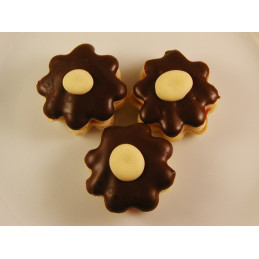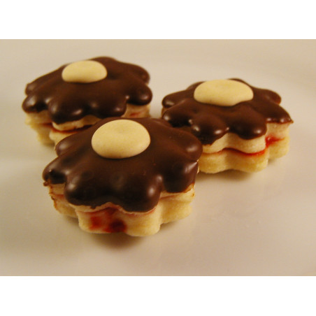Mit Schokoladenglasur und einer Dotter/Zucker-Masse verziert.