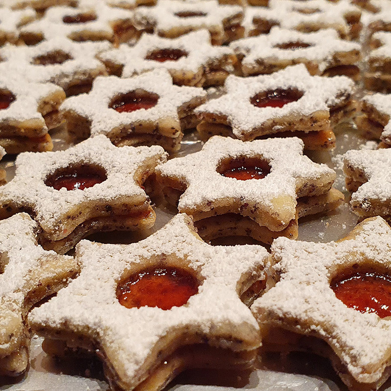 Sterne bestehen aus einen Mohn-Linzerteig und sind mit Ribiselmarmelade gefüllt.