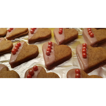Zutaten: Butter, Rohrzucker, Vollkornmehl, Eier, Zitronenschale, Erdbeermarmelade, Rosa/Weisse Zuckerperlen, Weisse Schokoladenglasur, Rote Lebensmittelfarbe