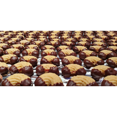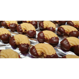 Kipferl sind mit Ribiselmarmelade gefüllt und mit Schokoladenglasur verziert.