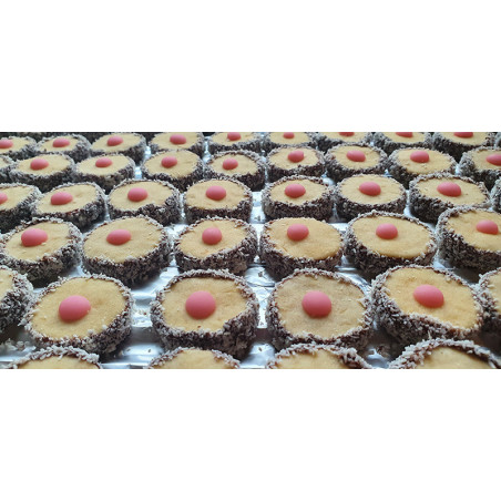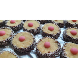 Küsschen sind mit einer Punschfülle gefüllt und mit Kokosette sowie Punschglasur verziert.